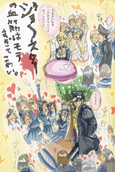 ジョルノって、さわやか大物ギャングで一応、ファンの中で通ってるけど、いろんな意味でやばいと思う。 5部序盤の、康一くんからギッてきたお金をカフェで数えてる神経とか そこに女の子が5人も寄ってきて「隣すわってもいい?」「あたしがお金払うからぁ」とか言われても「うるさいなぁ、一人が好きなんだよ、あっち行けよ」で返すところとか。 こいつ、これでも15歳なんだぜ・・・・! KOWAI・・・!!!!お父さんの倍は怖いよ・・・! ジョルノって女の子に冷たいですね、あんな可愛い女の子がキャッキャいうてくれるのに。 女の子も聞きわけがいい。「はぁーい、また明日ねー」とか。ジョルノの対応に慣れてやがるwwww 承太郎はなんかまあ、女嫌いを自称してるからいいんだけど、仗助ってどうなんでしょうね。 女の子に囲まれてましたけど。 女の子たちも流石、仗助ファンだけあって髪型に理解があるよね。 確か、ネズミハンティングの時に「俺って純愛タイプだからなぁー」とか言ってましたね。 そうか、好きな女の子以外は興味なしか。恵まれてるなあ、億㤗大泣きだな。 興味ないけどつっぱねる程冷たくもない、それが仗助。 ジョジョって女の子にモテる男がぞろぞろ出てくるので困ります。 シーザー然り、ホルホース然り。 女の子にキャッキャ言われるシーンが出てこないだけで、プロシュート兄貴とかも相当なもんだと思うけど。 でも、サーレーあたりはいつも「また女に逃げられたー、クソがー」とかぶつぶつ言ってそうなのはなんでだろう。チンピラっぽいからか。 徐倫もロメオという彼氏をきっちりキープしてたり、アナスイに非常にしつこく求愛されたり、グェスに変な愛され方されたりと結構なモテっぷりなんですけどね。 でも、なんというか、やっぱりジョースター家では承太郎が一番モテそうな気がする。 ファンの間でたまに「結婚するならミスタ」「付き合うならミスタ」とかいうのをよく見かけますが、なんかよくわかる。 ジョースター家はちょっと超越しすぎちゃってんだよなー。 |