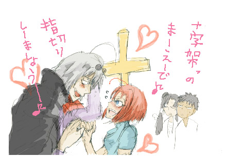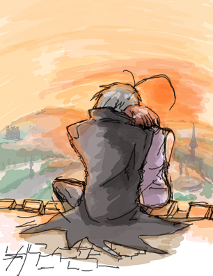 こんなことしてる場合じゃねえんす・・・、現実逃避です・・・。 まあ、そこまで熱が来てるってことでもないんだけど、描けるときに描いとけなマスターモスキートン。 語れるときに語っとけです。 モーちゃんに300年前に愛されて吸血鬼にしてもらった女カミル。 と、イナホちゃんとイナホちゃんのひいおばあちゃん。 パンティ&ストッキングwithガーターベルトのEDfallen angelの歌詞読んでたらカミルが悲しんでる絵かきたくなった。 ちうか、この歌ホントに奇麗ですよね。メロディも歌詞も。びっくりした。 http://p0rut0ru.blog9.fc2.com/blog-entry-3.htmlさんの和訳に感動したので、こちらからお借りしてます。 「昼も夜もあなたが恋しいのです」 とか 「私たちはとても近い そしてあなたを信じています こんなにも近い筈なのに遠くて触れられないのです いつか私を抱きしめて 私はあなたをこんなにも愛しているのだから」とか。 まだまだあるけど。 か、カミルっぽー。 本編見てるとイナホちゃん応援しちゃって、カミル・・・カミルよう・・・?ってイライラしちゃうけどね。 でもやっぱり永遠って時を考えると、モーちゃんに一番近い女ってカミルなんじゃないかなあとか思っちゃう。 でもイナホちゃんはモーちゃんとこども作りたい!ってシリアスなシーンでゆってたので、モーちゃんとの間にお子が出来たらまた立場が微妙に違うよなあ・・・。 最初は吸血鬼がこどもとか作れるんか?と思ったけど、モーちゃんも吸血鬼のクォーターだもんな、出来ないことはないのか。 どーもこの作品だと、吸血鬼=死者、て感じじゃなさそう。そーゆー不老不死な生命体みたいな。 モーちゃんがいつの日か復縁する気があるかどうかは知りませんが、カミルは永劫の彼方で待ってるみたいですからね。 本編でモーちゃんを愛するために「地獄の業火に焼かれようとも構わない!」って叫んだあたりからカミルが憎めない。 そんなカミルの心情考えると、fallen angel の「この誠意による愛に何故疑問をもっているの?」って歌詞がそれっぽくてせつねえ・・・。 別れるに至ったこともモーちゃん的には許せないことだったんだろうけどカミルとしては大したことじゃないのに何故まだ拘ってるの??って心境なんかなー。 背景にイナホちゃんとひいおばあちゃんを描いたのは、歌詞の「私たち」の意味取り違えてたから。 なんとなーく、イナホのおばあちゃんが 「あなたに導かれて 立っていられる。 そこがあなたの腕の中でなかったとしても 私は我慢する。 それが終わりの時だったとしても、それでも私の愛はそこにあり続けるでしょう」の部分で。 イナホちゃんが 「決して私を独りにしないと誓ってくれますか? あなたの腕に自らを委ねたい」の部分な感じ。 まあ、結論として、モーちゃんはホント罪な男です。 そしてfallen angel はホント名曲です。 吸血鬼ものといえば、吸血姫 美夕のOVAも大好き。 ホント名作ですね、あれ。TV版も嫌いじゃないけどOVAの出来は凄いな。 いつかレビューとかしたいです。 え、あ、HELLSINGですか?超好きです。 吸血鬼はロマンです。 |